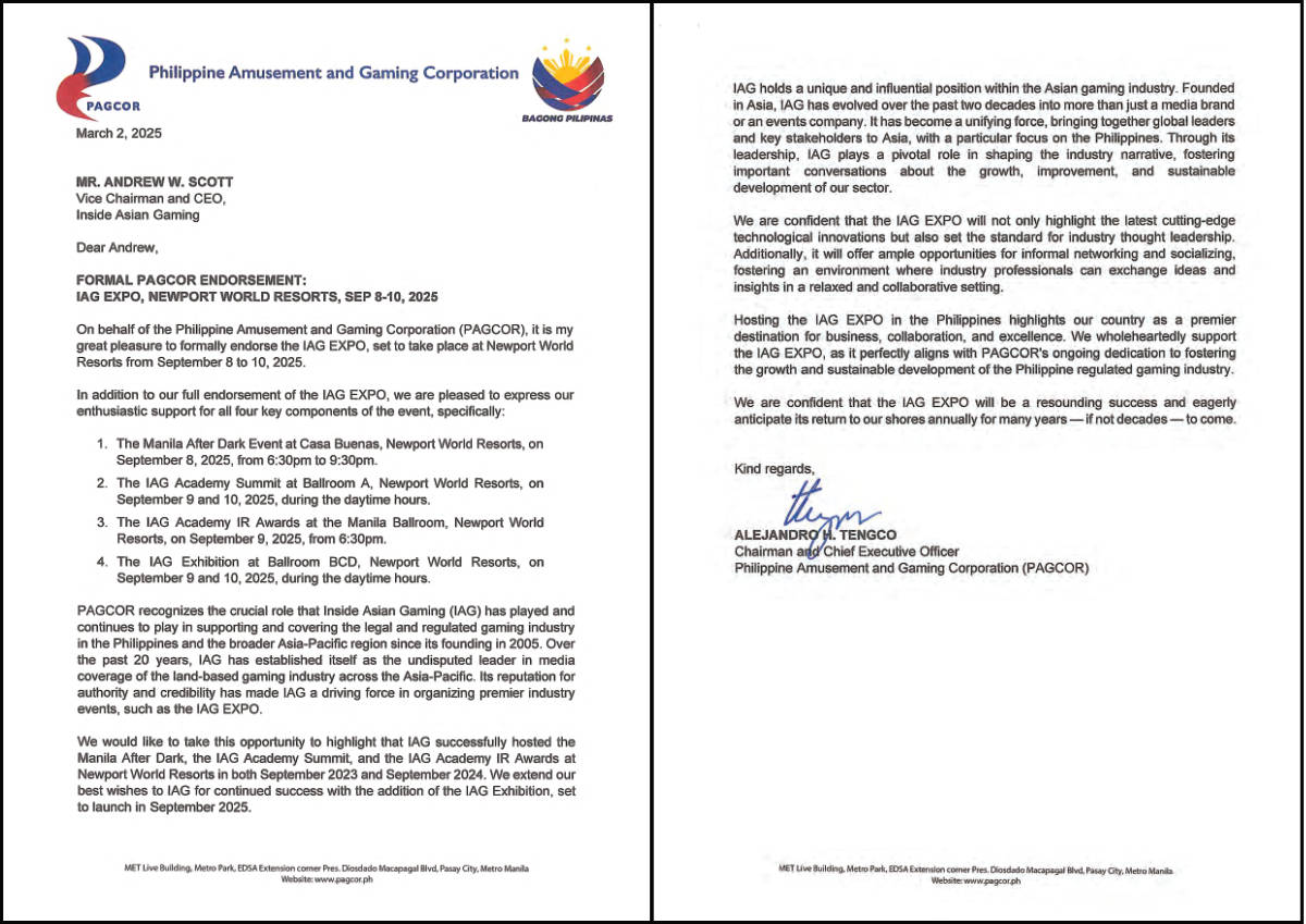 Below is PAGCOR’s endorsement of the 2025 IAG EXPO. This will be updated upon issuance of PAGCOR’s endorsement of the 2026 IAG EXPO.